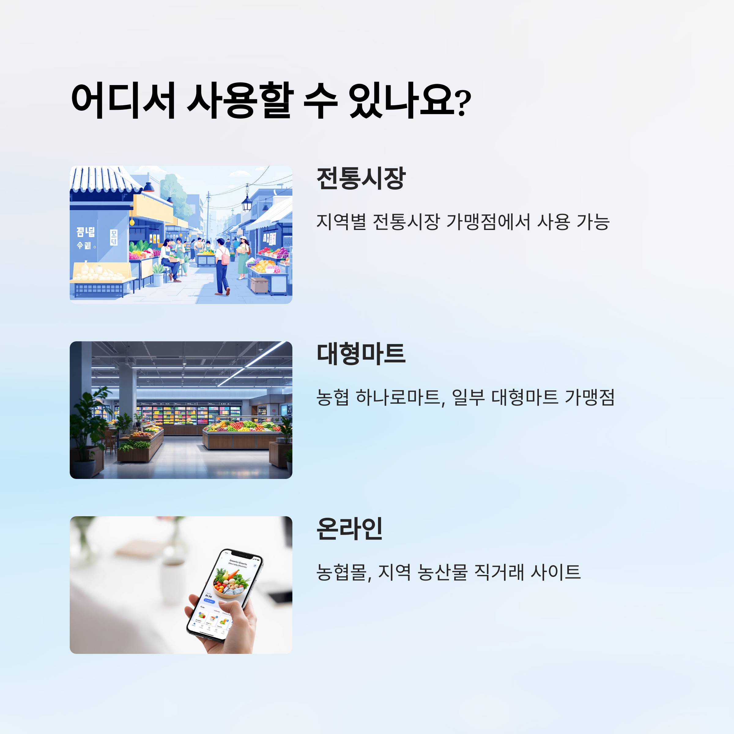| 신선한 농산물 구매 가능 | 가맹점이 적어 이용이 불편할 수 있음 |