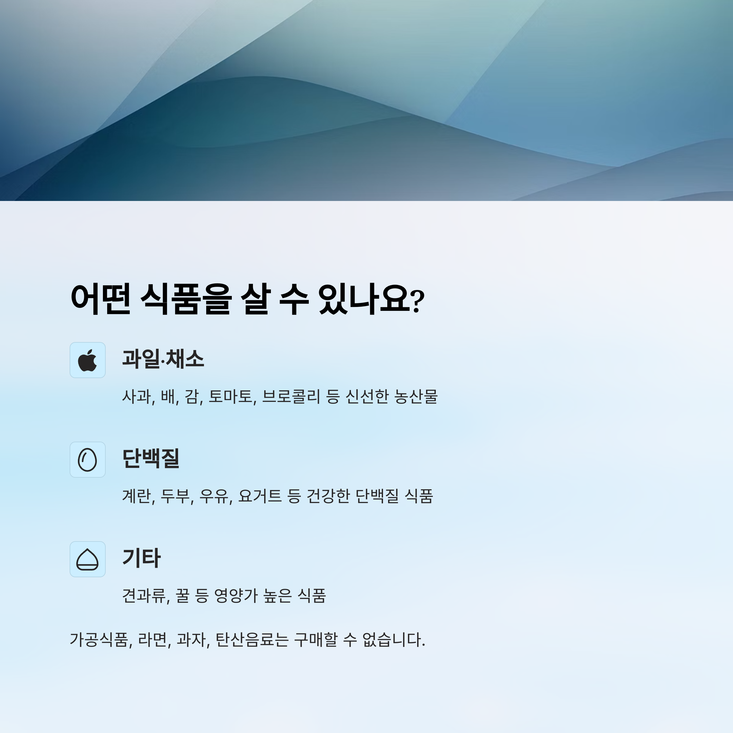 허용 품목에는 채소, 과일, 달걀, 우유, 두부 등이 포함돼요. 반면 라면, 과자, 탄산음료 같은 가공식품은 구매할 수 없어요. 🚫