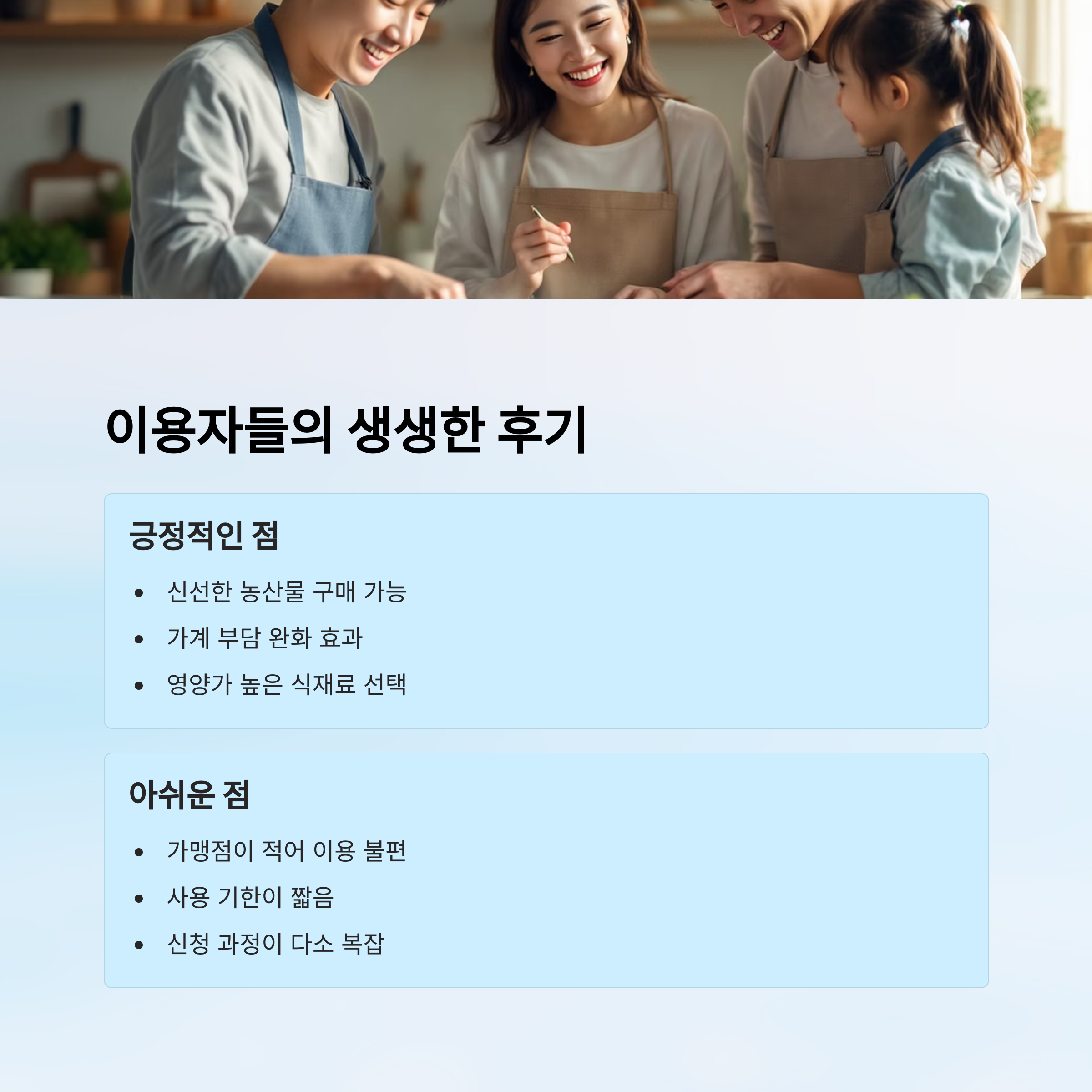 특히 가계 부담이 큰 저소득층 가구에서 유용하게 사용하고 있어요. 아이를 키우는 가정에서는 영양가 있는 식재료를 살 수 있어서 만족도가 높아요. 👶🥛