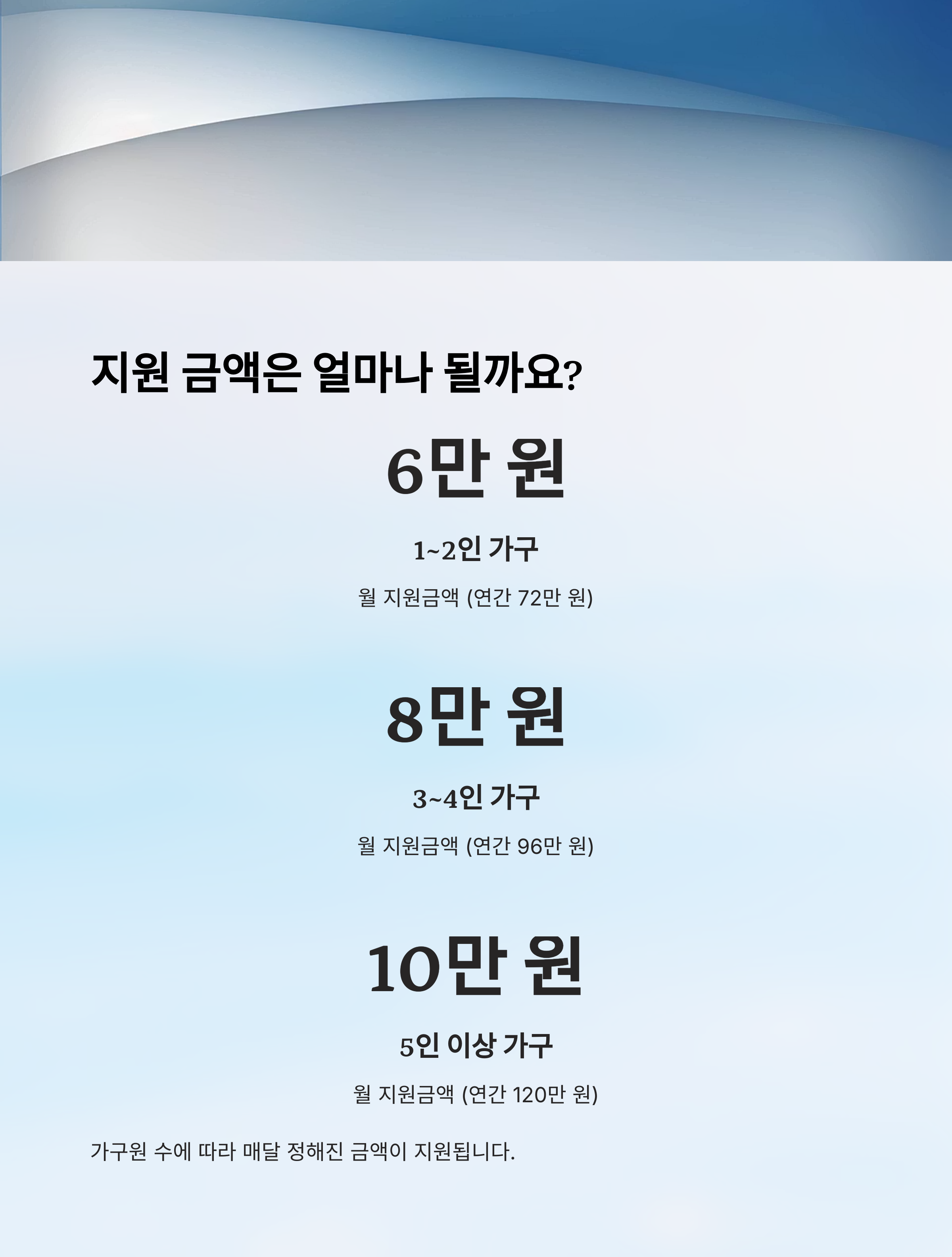 | 가구원 수 | 지원 금액 (월) | 연간 최대 지원액 |
