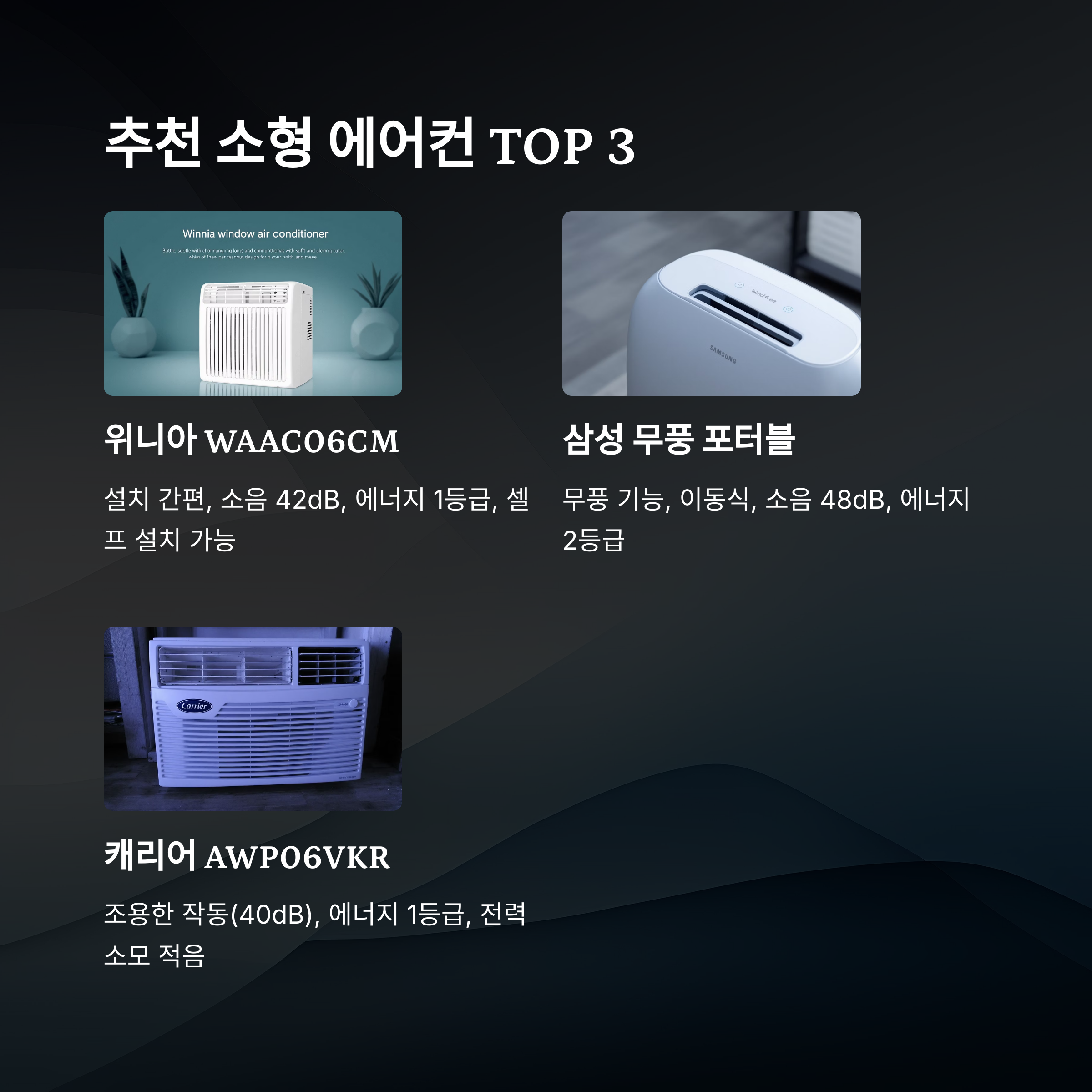 | 위니아 WAAC06CM | 창문형 | 42dB | 1등급 | 셀프 설치 |