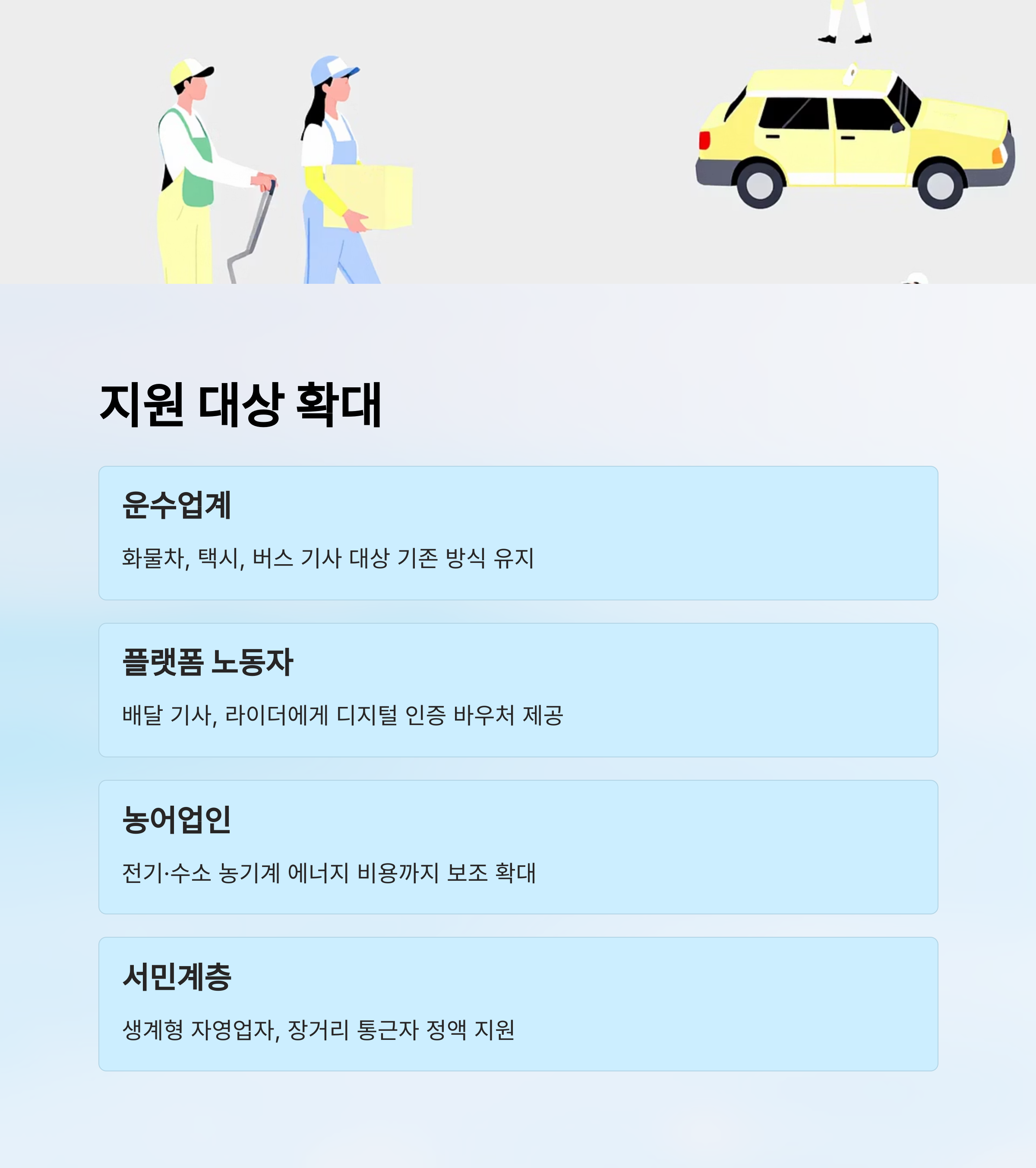 2025년 유류비 지원 정책의 가장 두드러진 변화 중 하나는 지원 대상의 대폭 확대예요. 과거에는 화물차, 버스, 택시 등 운수업계 중심이었다면 이제는 배달업 종사자, 소규모 농가, 어민, 이동식 판매업자 등까지 포함되고 있어요.