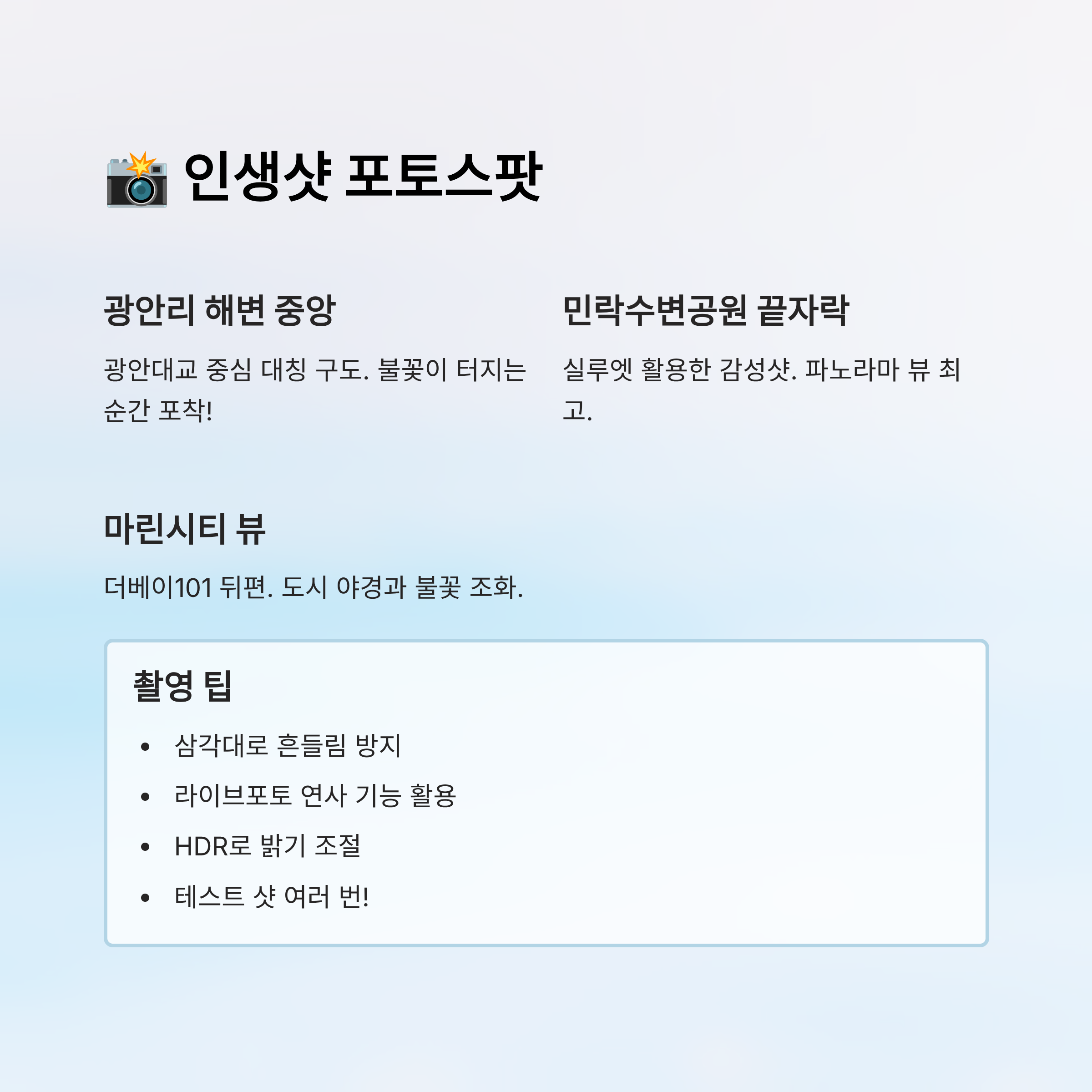 각 명당은 관람 목적에 따라 선택하면 좋답니다. 활기찬 분위기를 원한다면 광안리 해변, 여유롭게 감상하고 싶다면 이기대나 카페거리, 가족 단위라면 민락수변공원이 잘 어울려요.