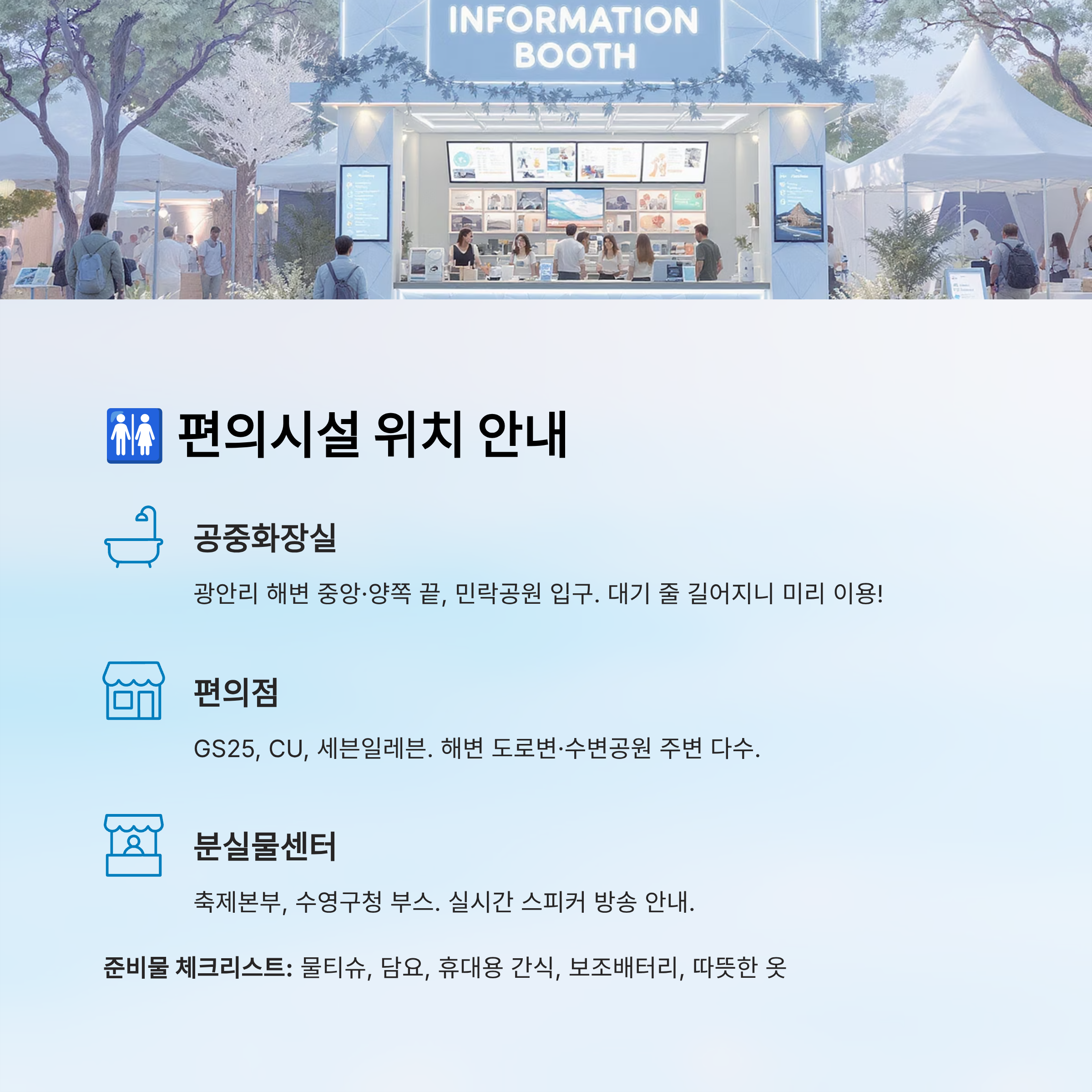 광안리 해수욕장에는 해변 중앙과 양쪽 끝에 공중화장실이 마련되어 있어요. 하지만 행사 당일엔 대기 줄이 길어지므로 여유 있게 미리 다녀오는 걸 추천해요.