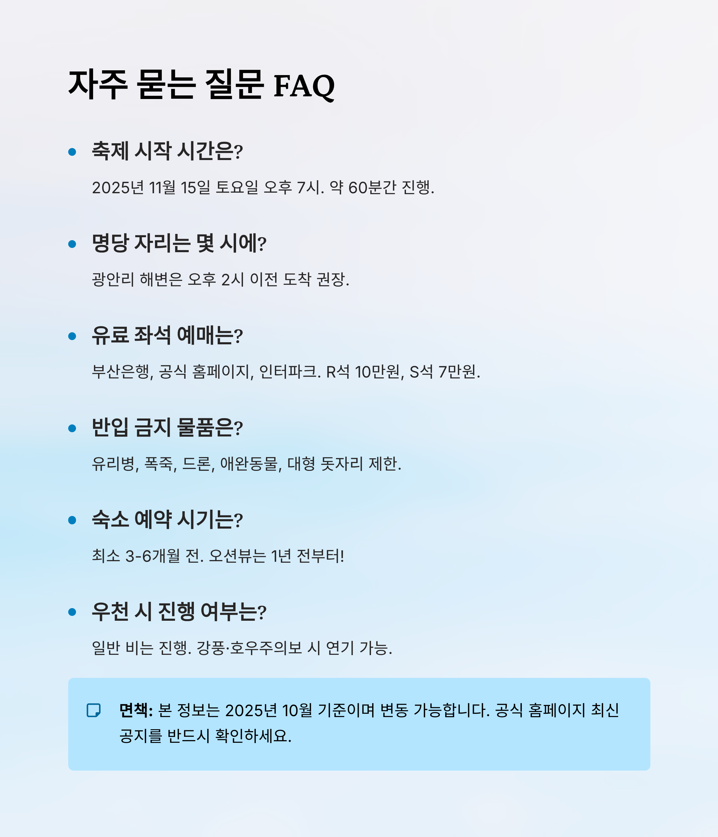 2025년 부산불꽃축제는 11월 15일 토요일 오후 7시에 시작돼요. 하지만 광안리 일대는 당일 오후 4시 30분부터 차량 통제가 시작되기 때문에, 자가용 이용은 매우 불편하답니다. 🚫