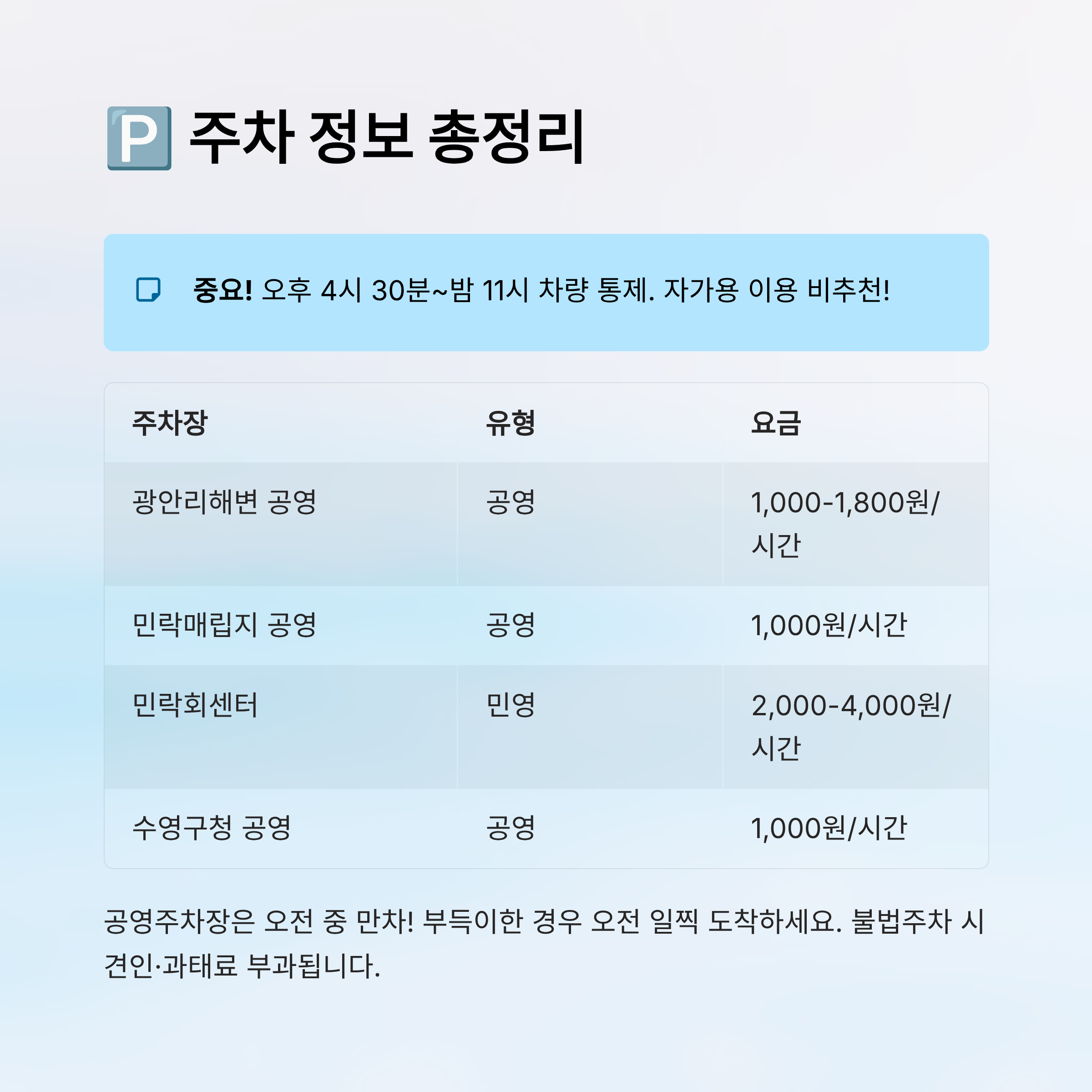 부득이하게 차량 이용 시에는 광안리해수욕장 공영주차장, 민락매립지 공영주차장, 수영구청 공영주차장 등이 가장 가까운 선택지예요. 하지만 이들 주차장은 오전 중에 대부분 만차가 되니 조기 진입이 필수예요.