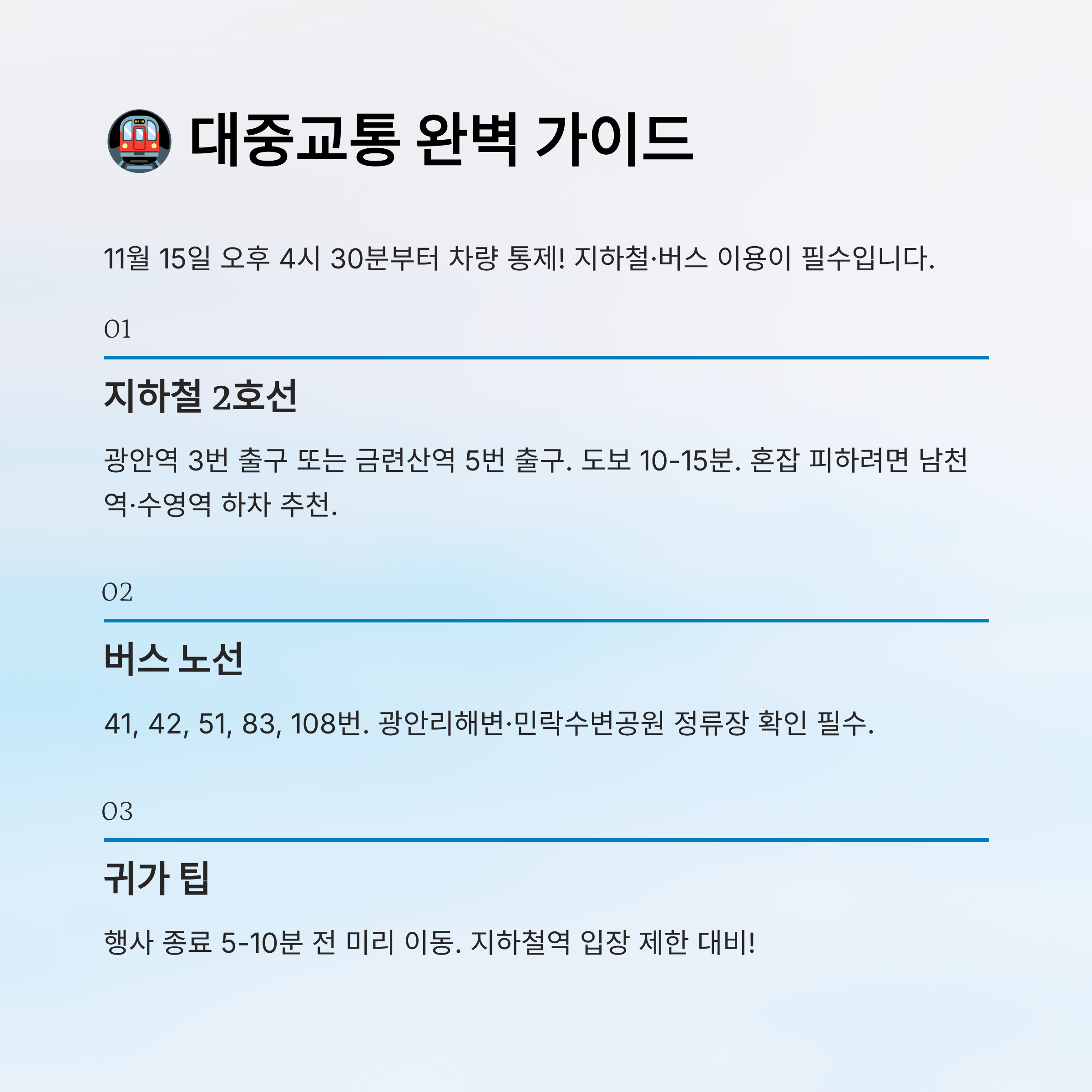 따라서 지하철과 버스를 활용한 대중교통 이용이 가장 효율적이에요. 특히 부산 지하철 2호선 광안역(3번 출구)이나 금련산역(5번 출구)에서 도보 10~15분 거리로 축제 현장까지 접근할 수 있어요.