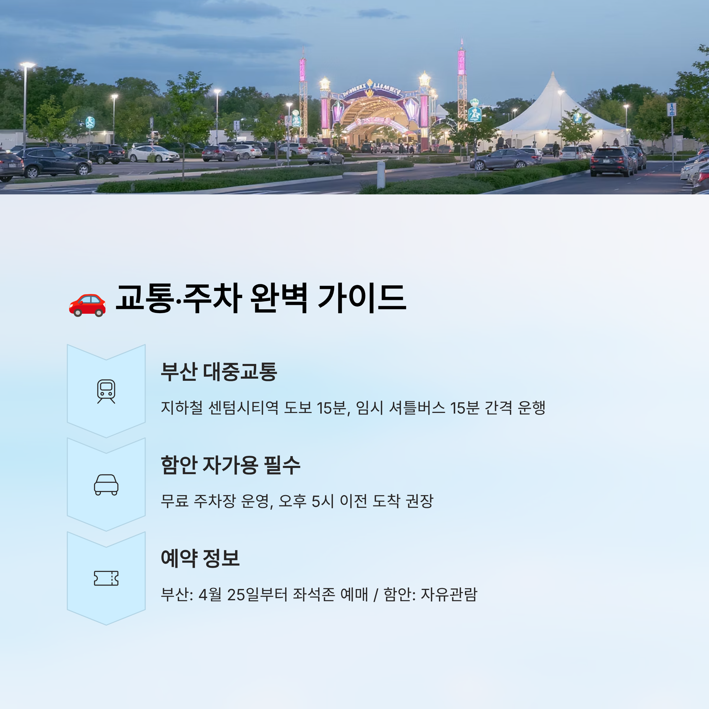 예약은 ‘부산 축제 공식 홈페이지’에서 가능하고, 2025년 기준으로 4월 25일부터 예매가 열려요. 좌석존을 예약하면 음료 쿠폰이 포함돼요. 반면 함안은 별도의 예매 절차가 없어요. 하지만 그만큼 자유롭게 관람할 수 있어서 현장 분위기를 더 생생하게 느낄 수 있어요.