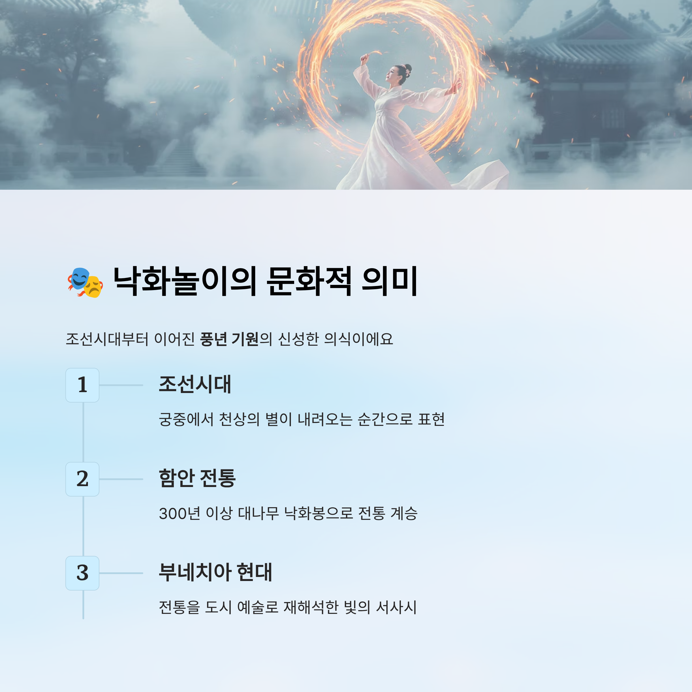 낙화놀이는 단순히 불꽃을 감상하는 행사가 아니라, 우리 조상들이 불을 통해 하늘과 땅을 잇던 신성한 의식에서 비롯됐어요. 조선시대 궁중에서도 봄철 농사의 풍년을 기원하며 낙화를 즐겼다는 기록이 남아 있어요. 당시에는 불씨가 떨어지는 모습을 ‘천상의 별이 내려오는 순간’이라고 표현했다고 해요. 그만큼 낙화는 단순한 불빛이 아니라, 인간의 소망과 축복을 담은 예술이었죠 🔥