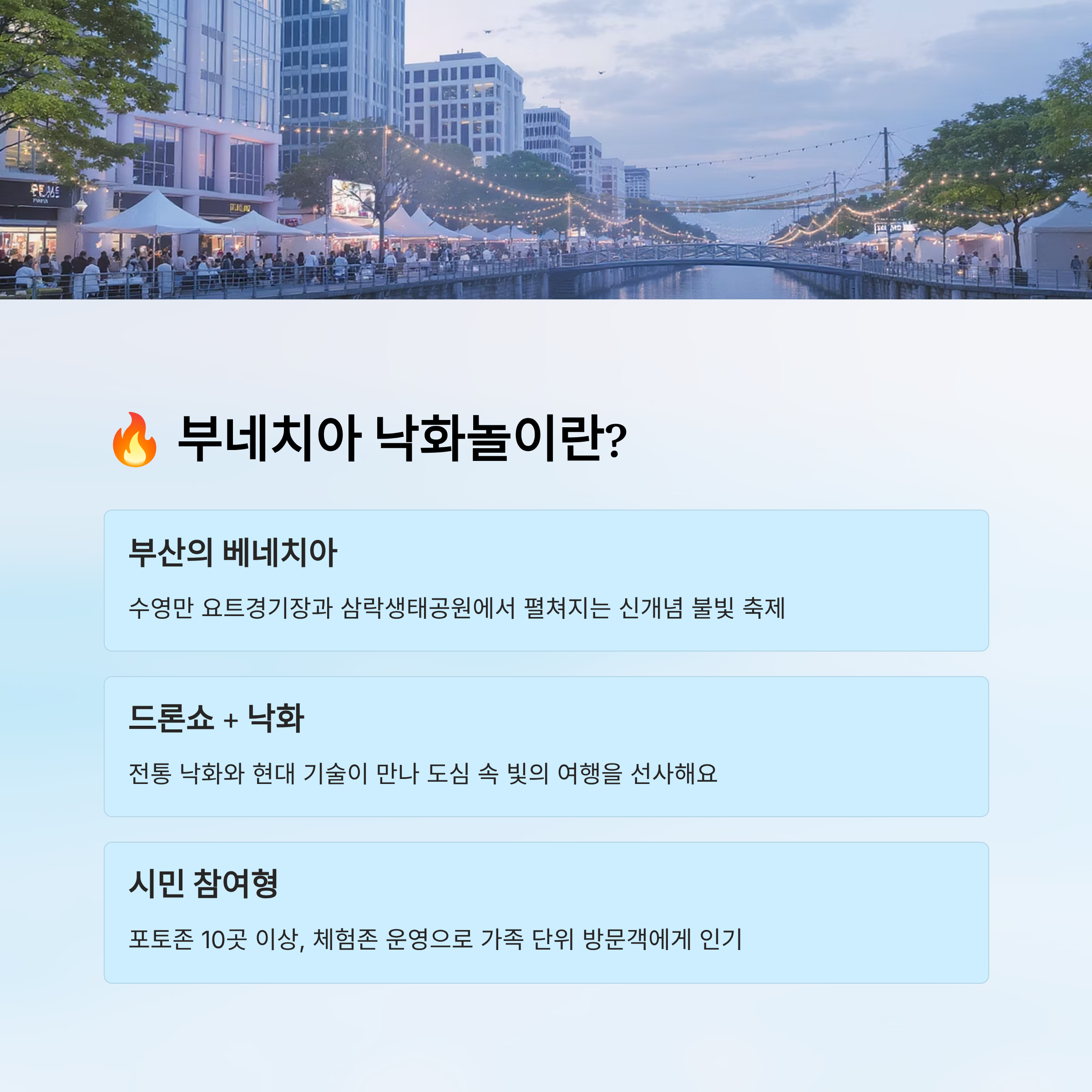 ‘부네치아 낙화놀이’는 부산의 수변 명소인 ‘삼락생태공원’과 ‘수영만 요트경기장’ 일대를 중심으로 진행되는 신개념 불꽃·불빛 축제예요. 이름처럼 ‘부산의 베네치아’라는 의미를 담고 있죠. 2025년에는 낙화(落火) 퍼포먼스와 드론쇼, 수상불빛 공연이 어우러지는 형태로 확장되어 이전보다 훨씬 화려하게 준비되고 있어요. 부네치아는 단순한 불꽃축제가 아니라, ‘도심 속 빛의 여행’으로 기획된 것이 특징이에요.