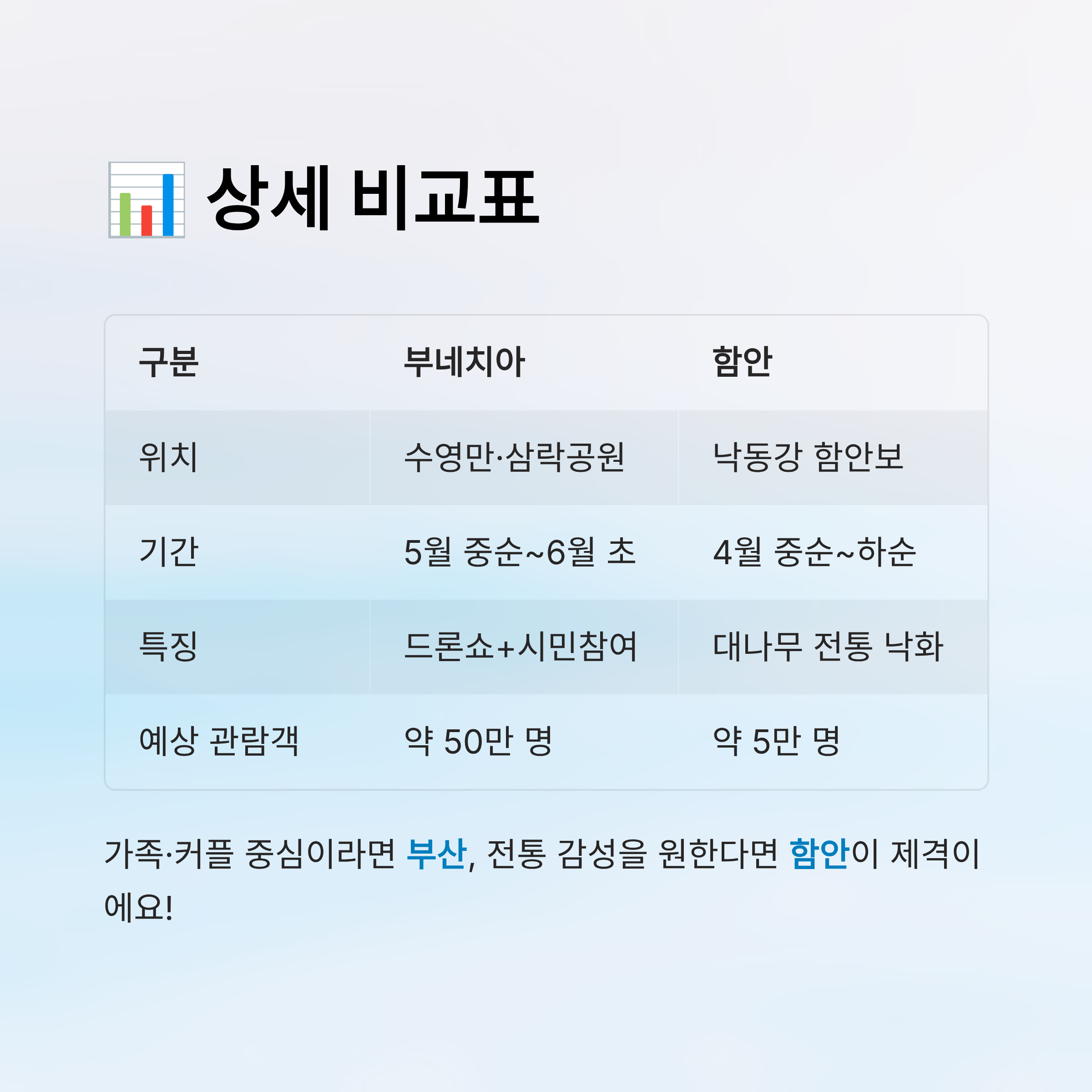 두 행사는 모두 아름답지만 ‘무엇을 기대하느냐’에 따라 선택이 달라져요. 가족·커플 중심이라면 부산, 전통과 감성 중심이라면 함안이 더 잘 어울려요. 결국 두 낙화놀이는 경쟁 관계라기보다, 서로 다른 매력을 지닌 두 개의 계절 풍경 같아요. 🌌