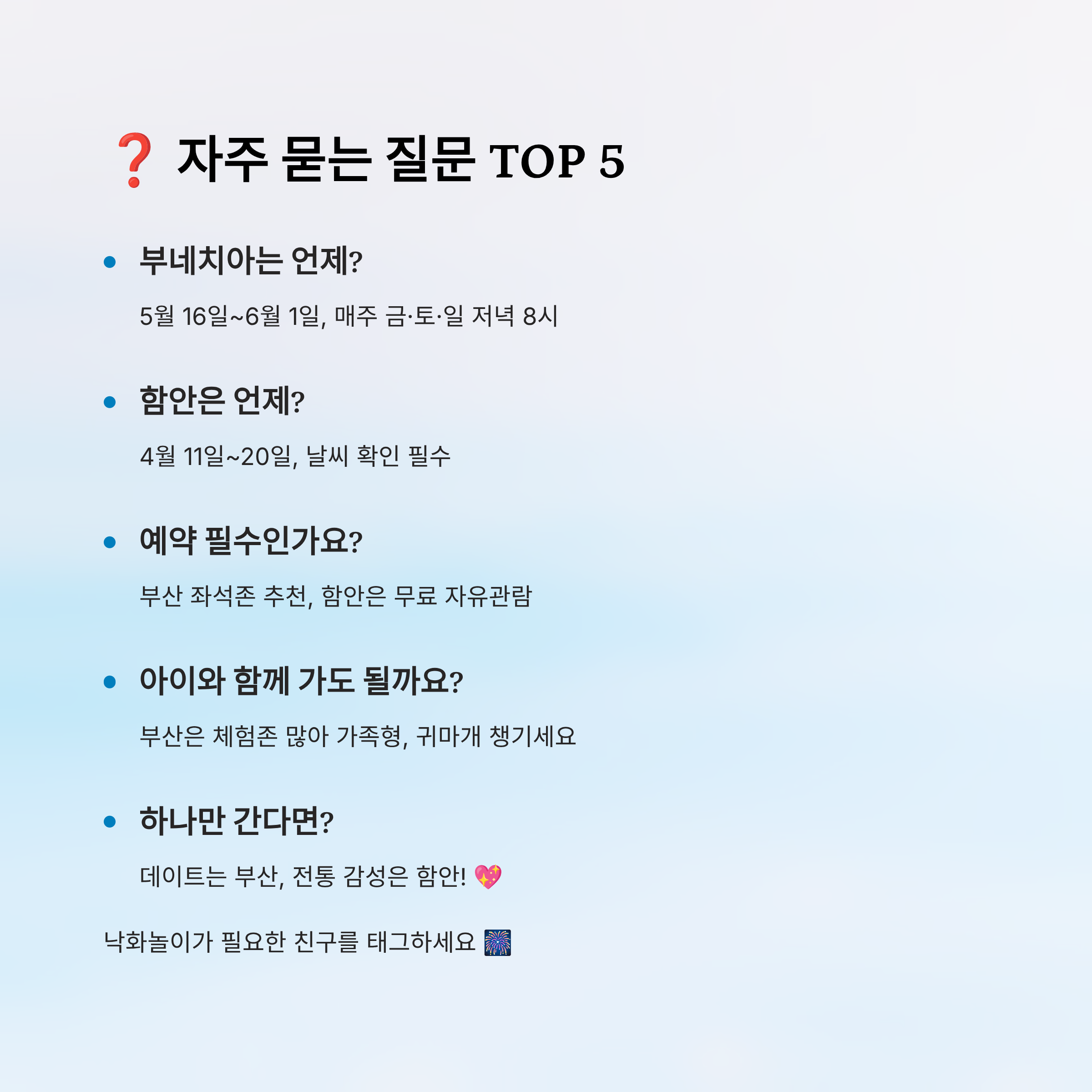 A8. 도심의 화려한 분위기와 데이트 감성을 원한다면 부산 부네치아 낙화놀이, 전통의 고즈넉함과 감동을 느끼고 싶다면 함안 낙화놀이를 추천해요. 두 곳 모두 각자의 매력이 확실해요 💖
