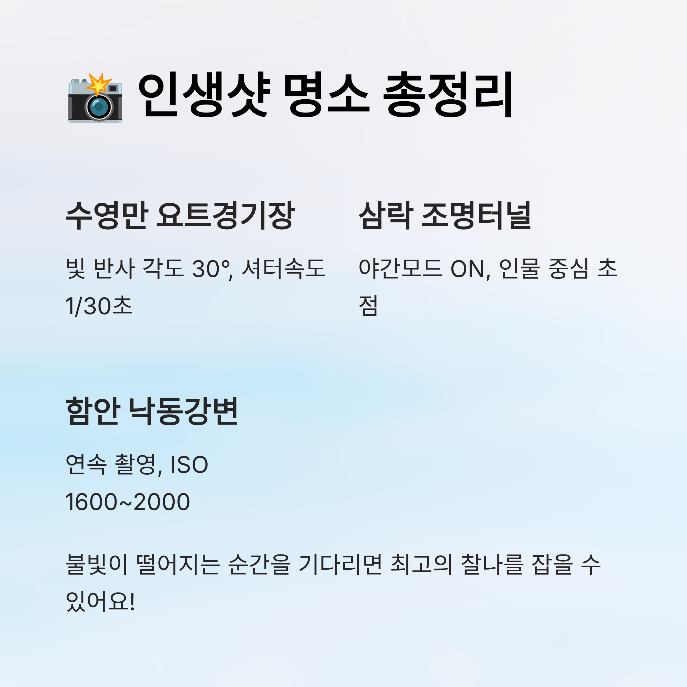 수영만 요트경기장 해변 데크 위, 불빛 반사 각도 30° 삼각대 고정, 셔터속도 1/30초 권장
