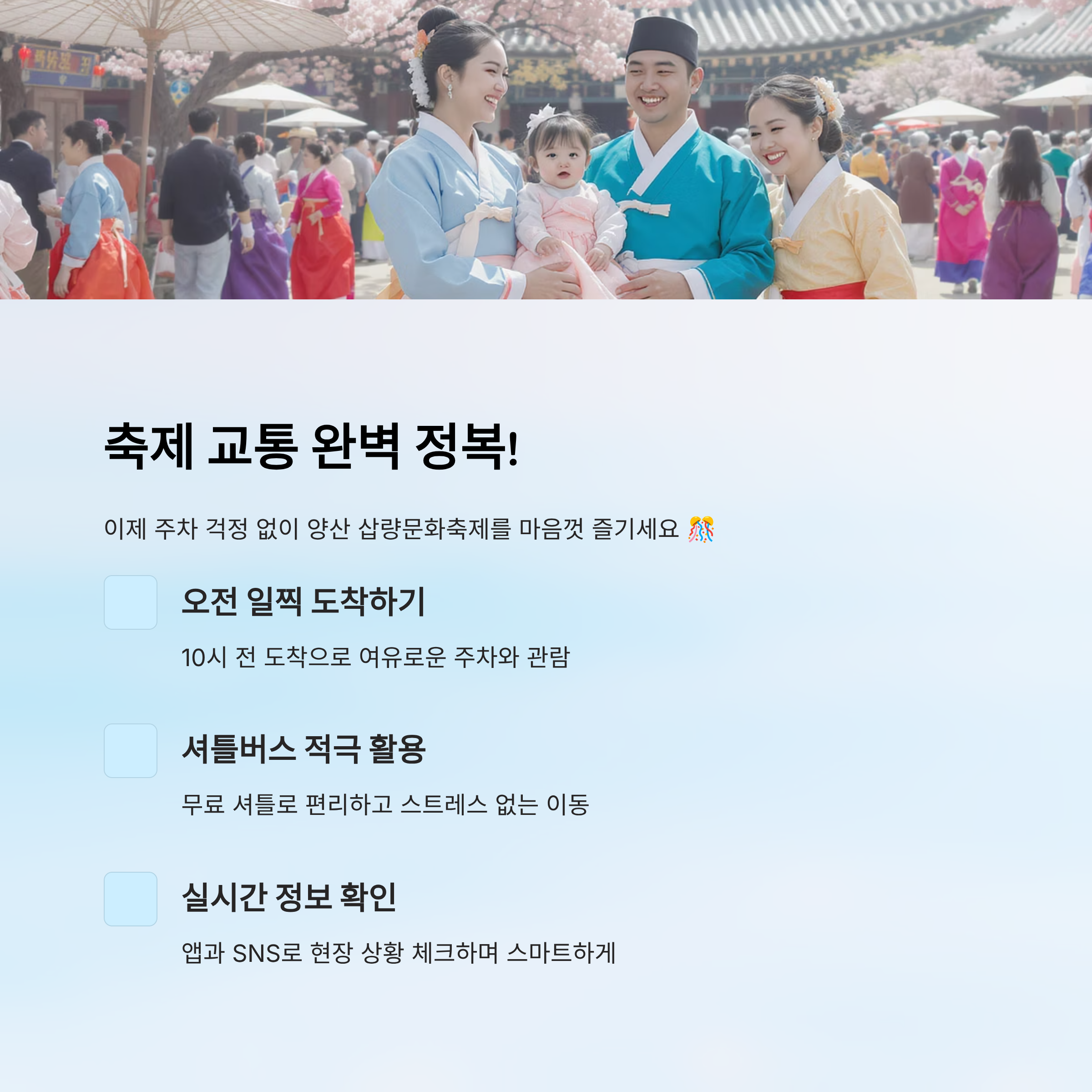 또 하나 팁! **양산시 공식 블로그 & 인스타그램** 계정에서도 실시간 셔틀 운행 상황, 공연 지연 공지, 긴급 안내사항 등이 빠르게 올라오니, 사전에 팔로우해두면 정말 유용하답니다. 📲