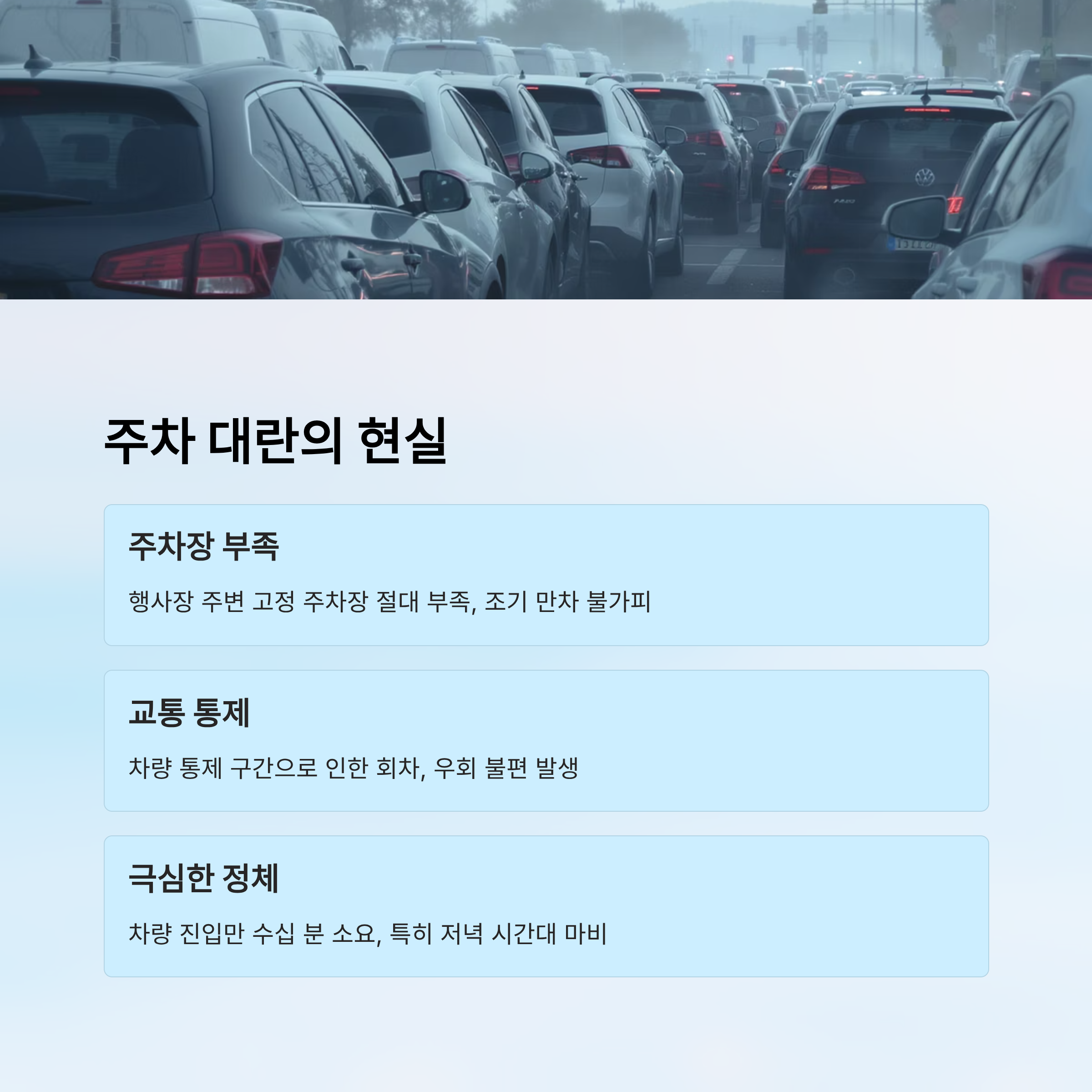 주차장 만차로 인한 대기 줄, 한정된 출입구, 차량 밀집으로 인한 정체까지 겹쳐서 차량 진입만 수십 분 이상 소요되는 경우도 있어요. 그래서 **임시주차장과 셔틀버스 이용**, 또는 대중교통을 적극 활용하는 것이 핵심이에요!