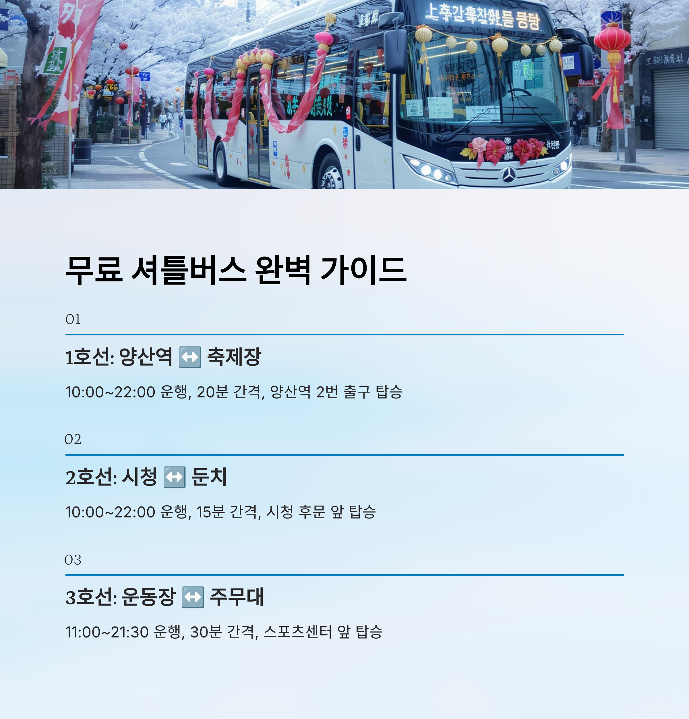 주요 노선은 '양산역 ↔ 양산천 둔치', '시청 주차장 ↔ 행사장', '종합운동장 ↔ 주무대' 노선으로 나눠지며, 각 노선마다 왕복 운행돼서 축제를 마친 후에도 편하게 이동할 수 있어요.
