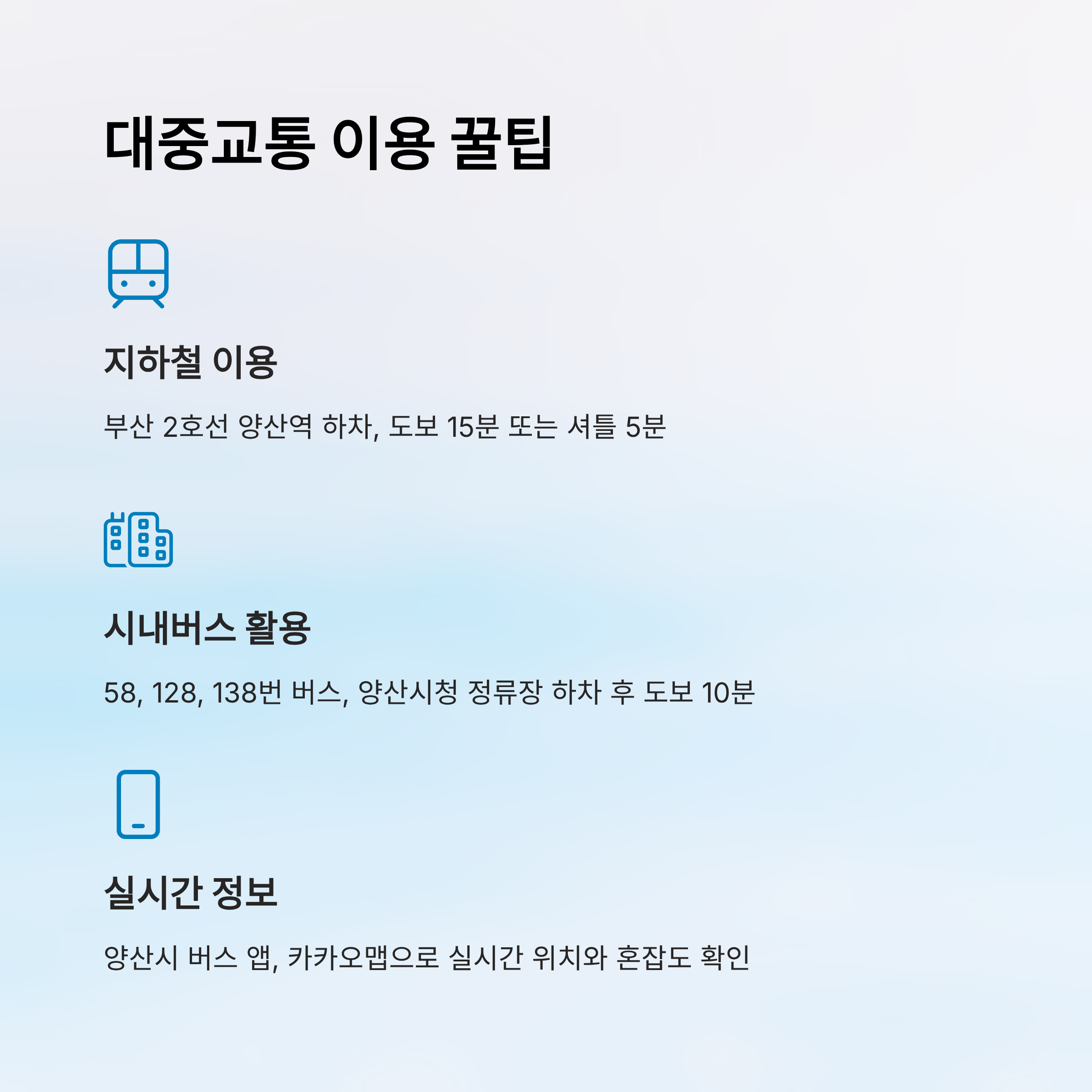 또 하나 꿀팁! 양산시 시내버스 앱 또는 카카오맵 버스 정보를 이용하면, 실시간 버스 위치와 소요 시간, 혼잡도까지 확인 가능하니 미리 확인하고 출발하는 걸 추천해요.