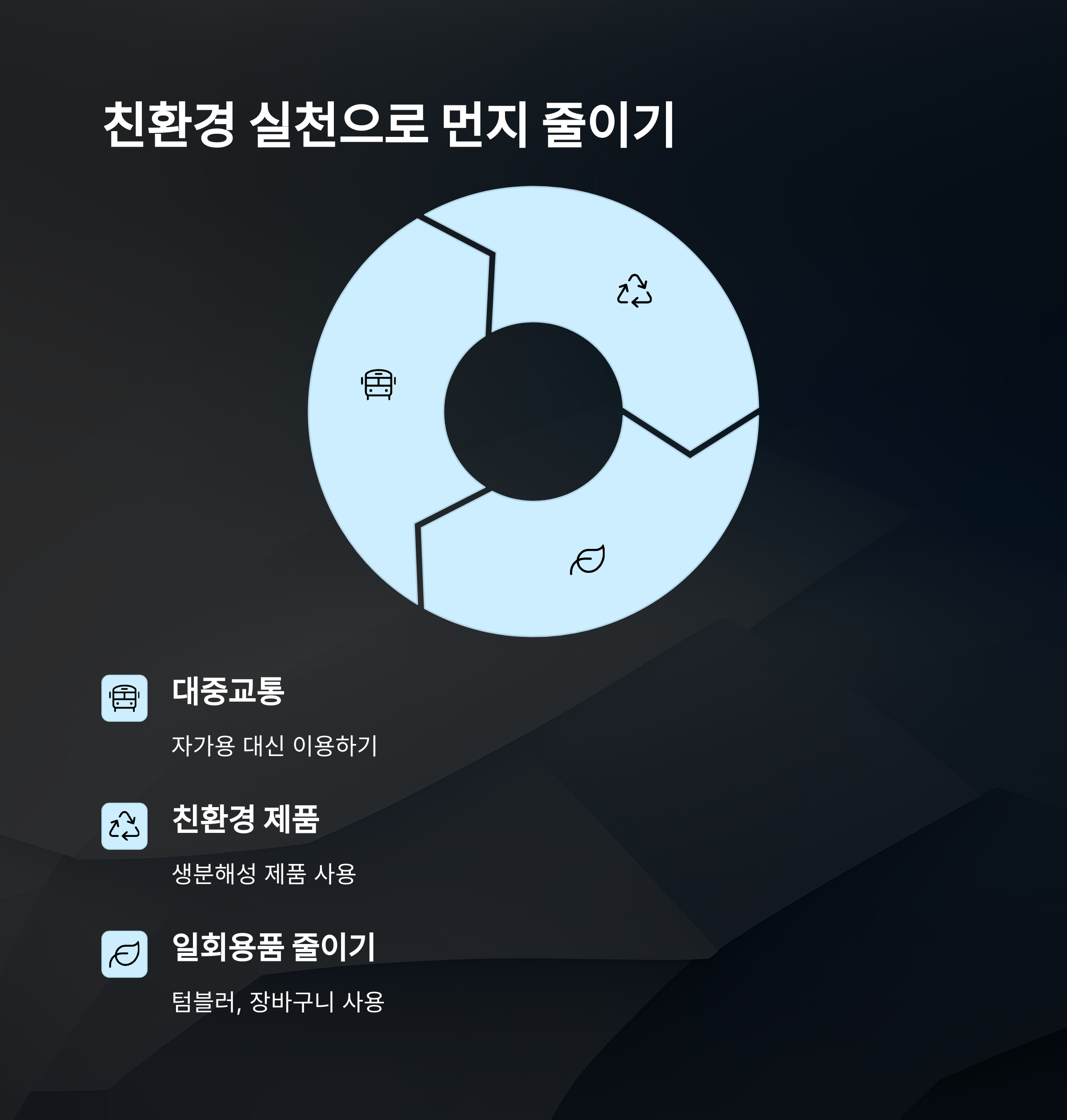 개인의 작은 행동 하나가 도시 전체 공기질을 바꿀 수 있어요. 친환경 생활 습관은 미세먼지 감소에도 효과적이에요.