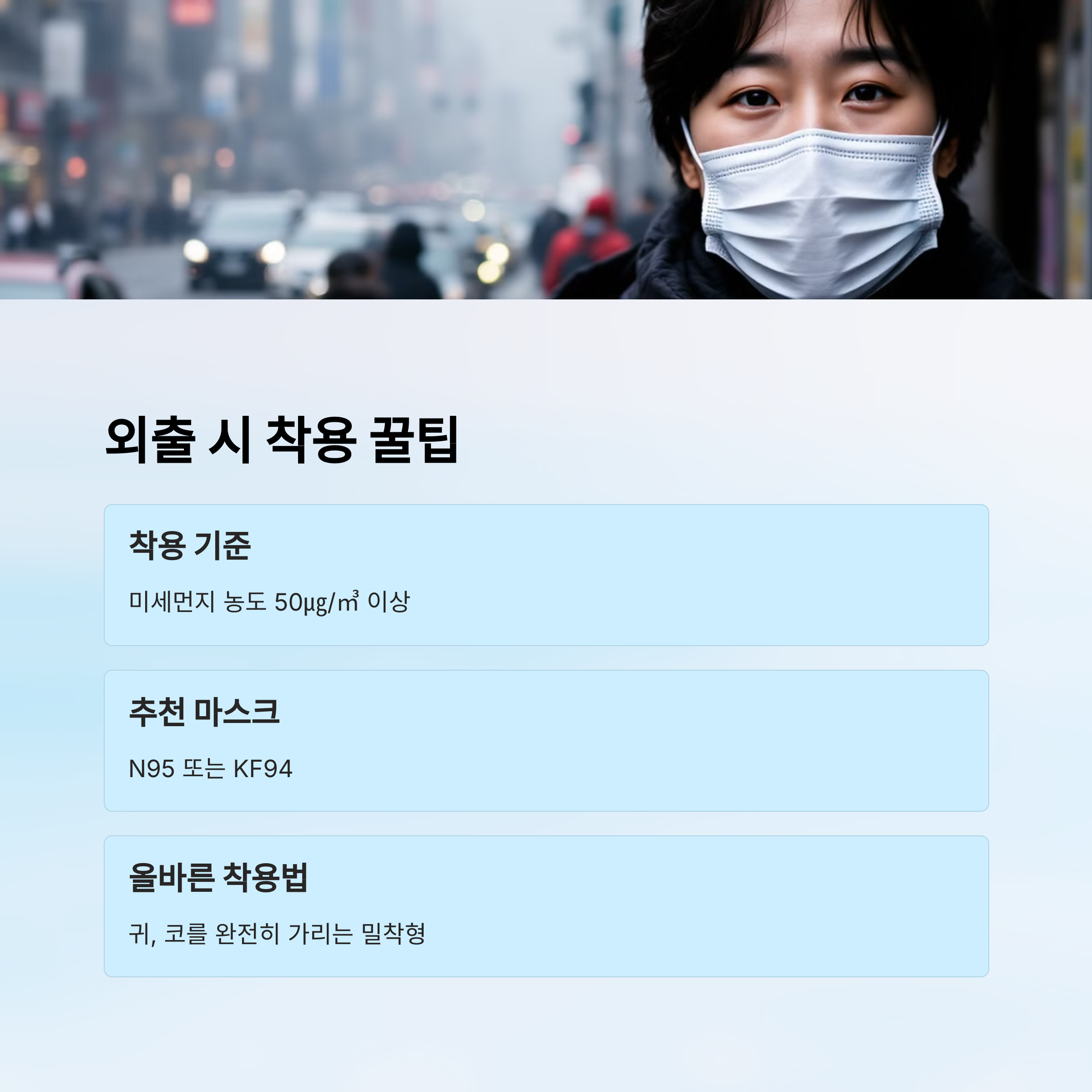 미세먼지가 많은 날엔 외출 복장도 전략적으로 준비해야 해요. 첫 번째는 KF 등급이 명시된 미세먼지 차단 마스크 착용이에요. KF80, KF94 같은 마스크가 기본이죠.